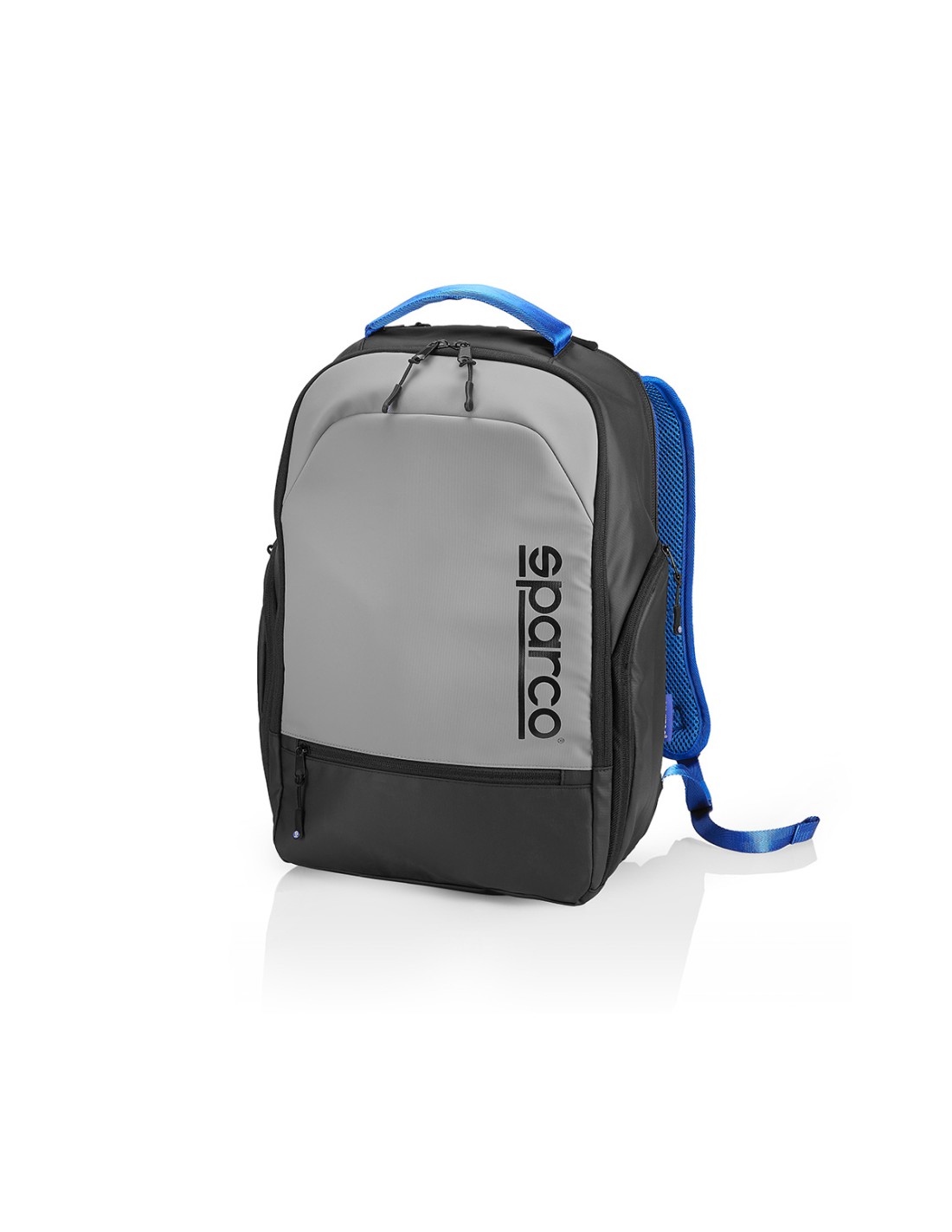 Zaino tempo libero/performance Sparco - In poliestere 600D con spalmatura gommata e schienale ergonomico imbottito e foderato con mesh traspirante - Schienale dotato di nastro orizzontale con logo Sparco per inserimento maniglia telescopica del trolley, spallacci imbottiti, regolabili e in tessuto traspirante, ampia apertura a zip con doppio cursore Sparco, pratica tasca frontale e 2 laterali a zip con cursore dedicato con logo Sparco, interno organizzato con tasche porta oggetti, vano porta laptop 15,6", separato con chiusura a zip, caricatore USB incorporato all'esterno e il cavo di ricarica integrato all'interno F.to cm 28x16x44h