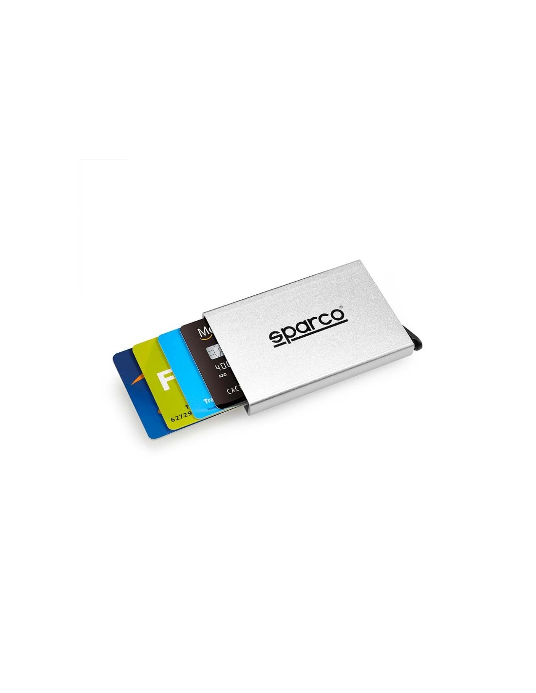 P/carte credito Sparco - In alluminio anodizzato con protezione RFID (anti-skimming), slot per 7 carte, pulsante espelli carte per la rapida estrazione - In scatola regalo - Colori: Grigio, Nero - F.to cm 6,5x9,5x1,3