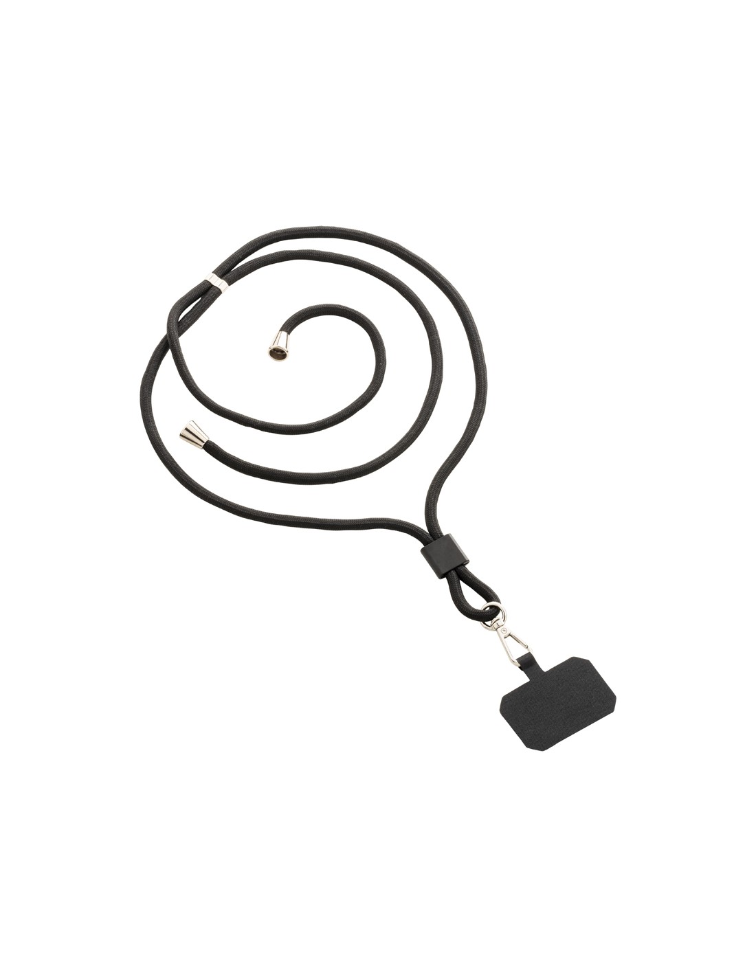 Lanyard con aggancio per smartphone - In poliestere con tag per la stampa, accessorio per il trasporto da inserire tra custodia e smartphone e moschettone girevole in metallo, regolatori del cordoncino con raccordi cromati elle estremit delle coulisse - Colore Nero -F.to cm 55 - 2x2 cm
