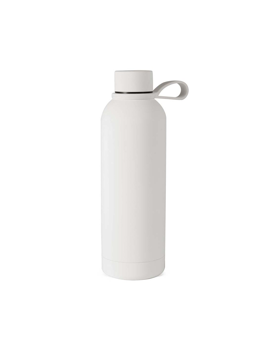 Borraccia termica soft touch da 500 ml - In acciaio inossidabile con effetto gommato al tappo - maniglia in silicone e tappo a vite - Confezione singola in scatola di cartoncino - Colori: Verde, Bianco, Nero - F.to cm  7,4 x 23