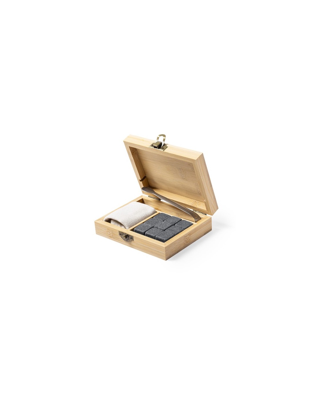Set di 9 cubetti di ghiaccio riutilizzabili - In pietra ollare naturale, conosciuta anche come pietra pomice - Include pinze in acciaio inossidabile e copertura in cotone - Confezionato in una custodia di bamb— - F.to cm 13,3x11,4x3,8