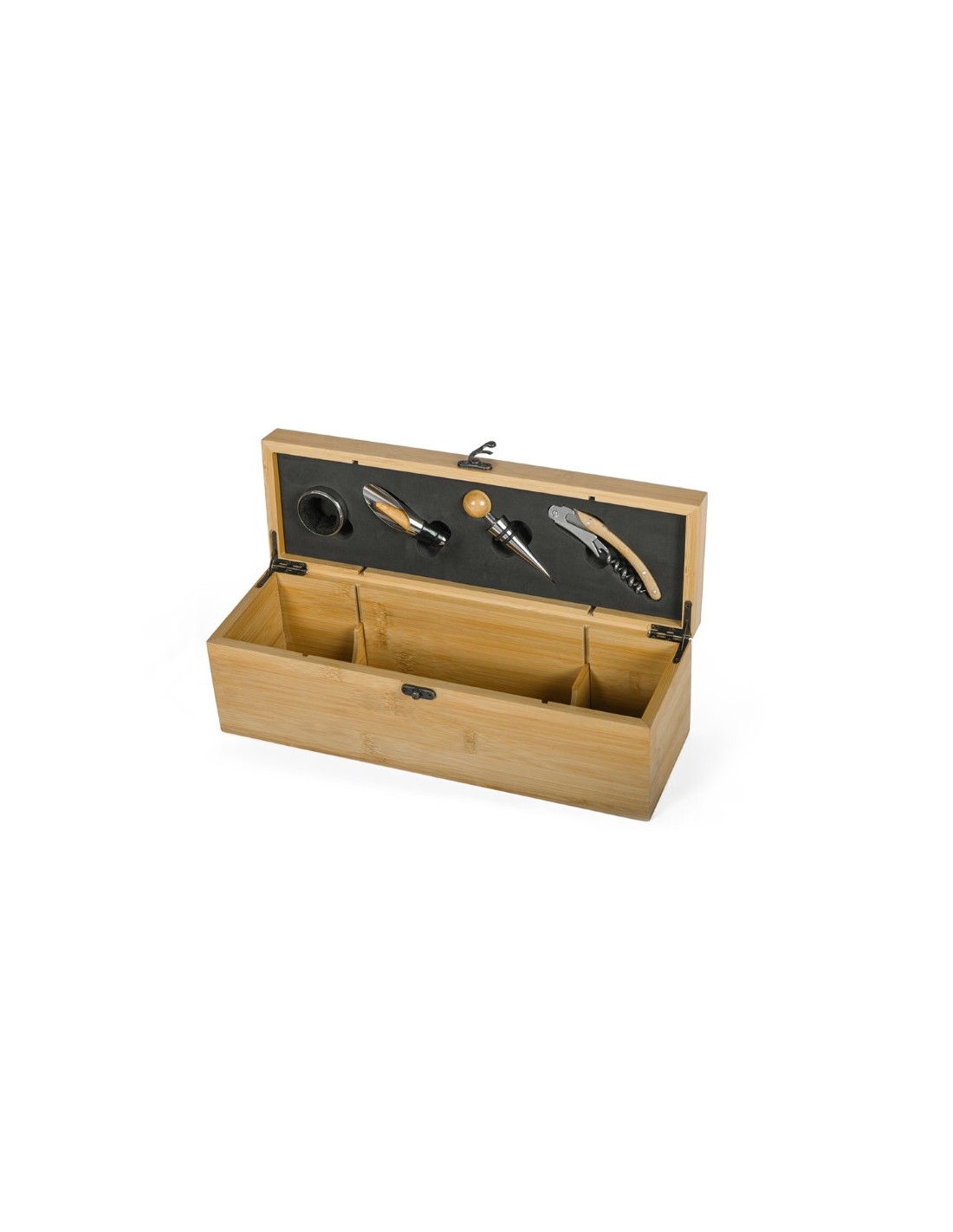 Set vino 4 pezzi con cassetta porta bottiglia in bamboo e metallo - Con accessori per la degustazione del vino: tappo, tappo dispenser, collare salvagoccia e cavatappi multiuso, chiusura con gancio in metallo (bottiglia non inclusa), confezionato in astuccio - F.to cm 35,8x11,8x11