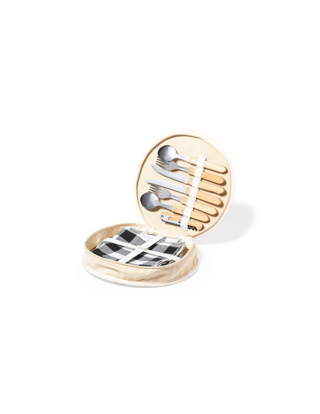 Set picnic da 2 coperti - 12 pezzi confezionato in una borsa 100% cotone con finitura naturale - chiusura a zip e maniglia per il trasporto - interno rinforzato - con scomparti per diversi accessori - Contiene:2 cucchiai, 2 coltelli e 2 forchette in acciaio inox con manico in legno naturale - 2 piatti in acciaio inox di 19,5 cm di diametro - 2 tovaglioli di stoffa 30x30 cm - Cavatappi in acciaio inox con coltello integrato e manico in legno naturale- Tagliere 15x15 cm in legno naturale e con manico fustellato - F.to Β 26,5x6