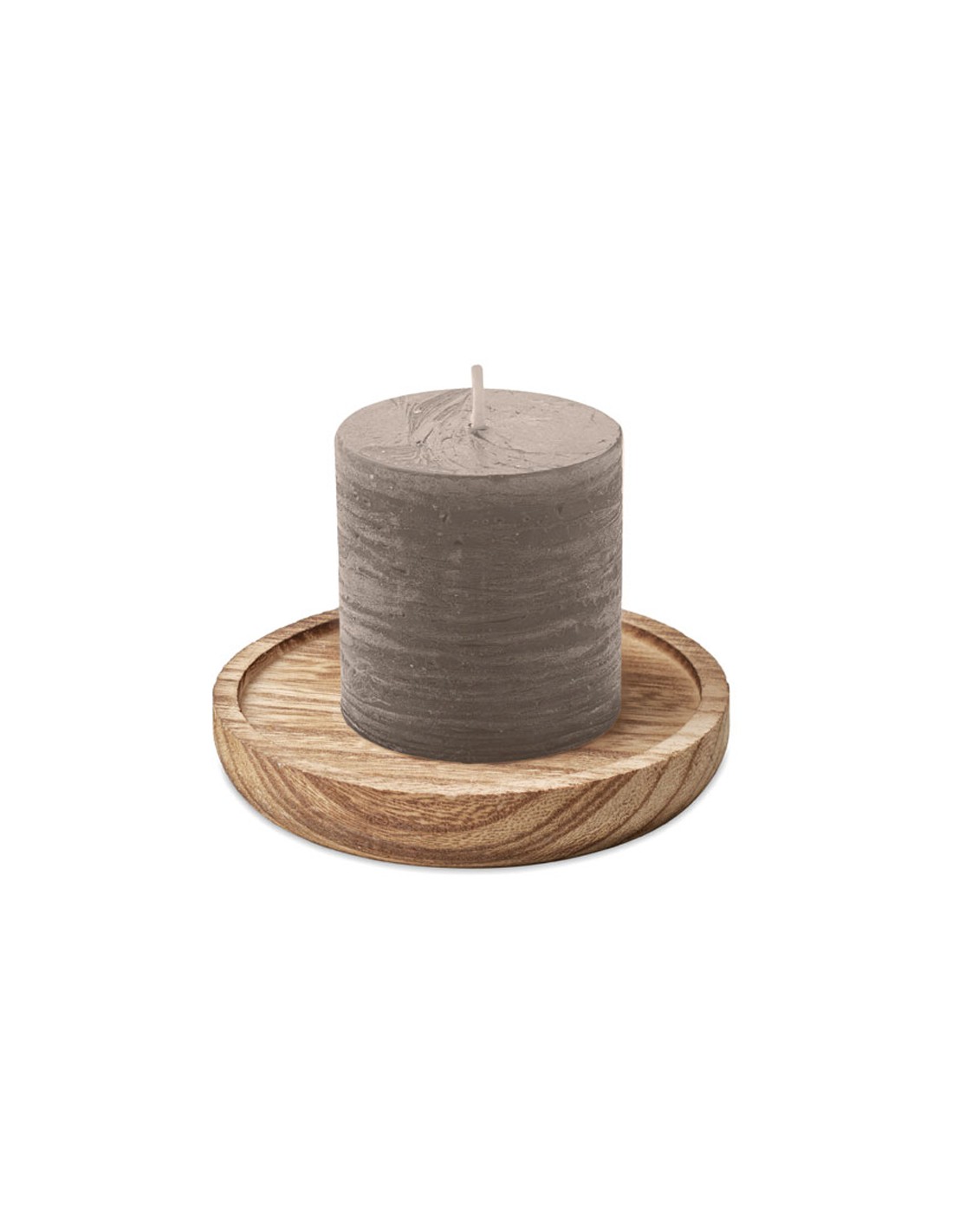 Candela profumata alla vaniglia con base rotonda in legno - Confezionata singolarmente in scatola di cartone - Colori: Grigio tortora, Oro - F.to Β 9 x 6,8 cm