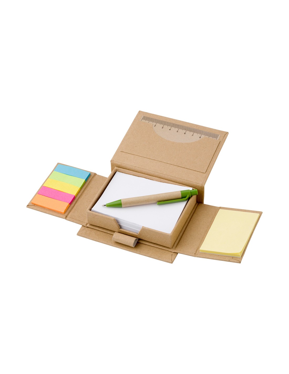Set memo in cartoncino con all'interno memo stick in vari colori, righello, penna a sfera con fusto e clip in cartone, refill blu - F.to cm 12x10,3x3