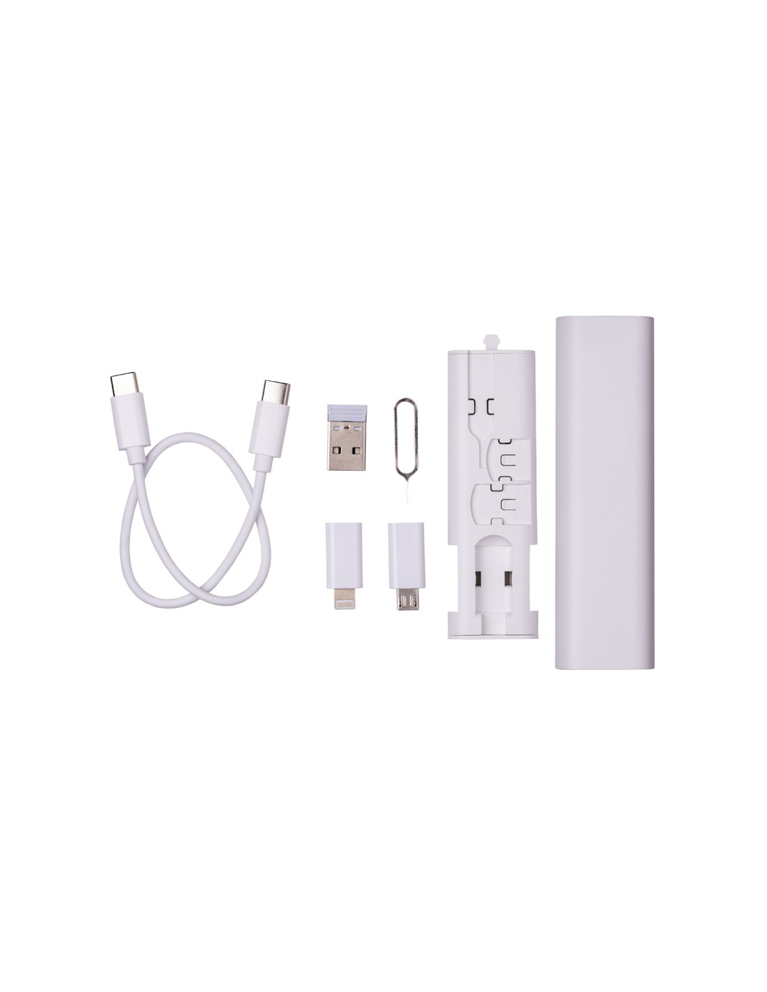 Set cavi di ricarica USB e Type-C in ABS/metallo - con adattatori Lightning, Micro USB, estrattore di SIM card - in box di plastica con alloggiamento per 1 Micro SIM e 1 Nano SIM - Colori: Nero, Bianco - F.to cm 10,7x3,2x1,6 - Cavo cm 29