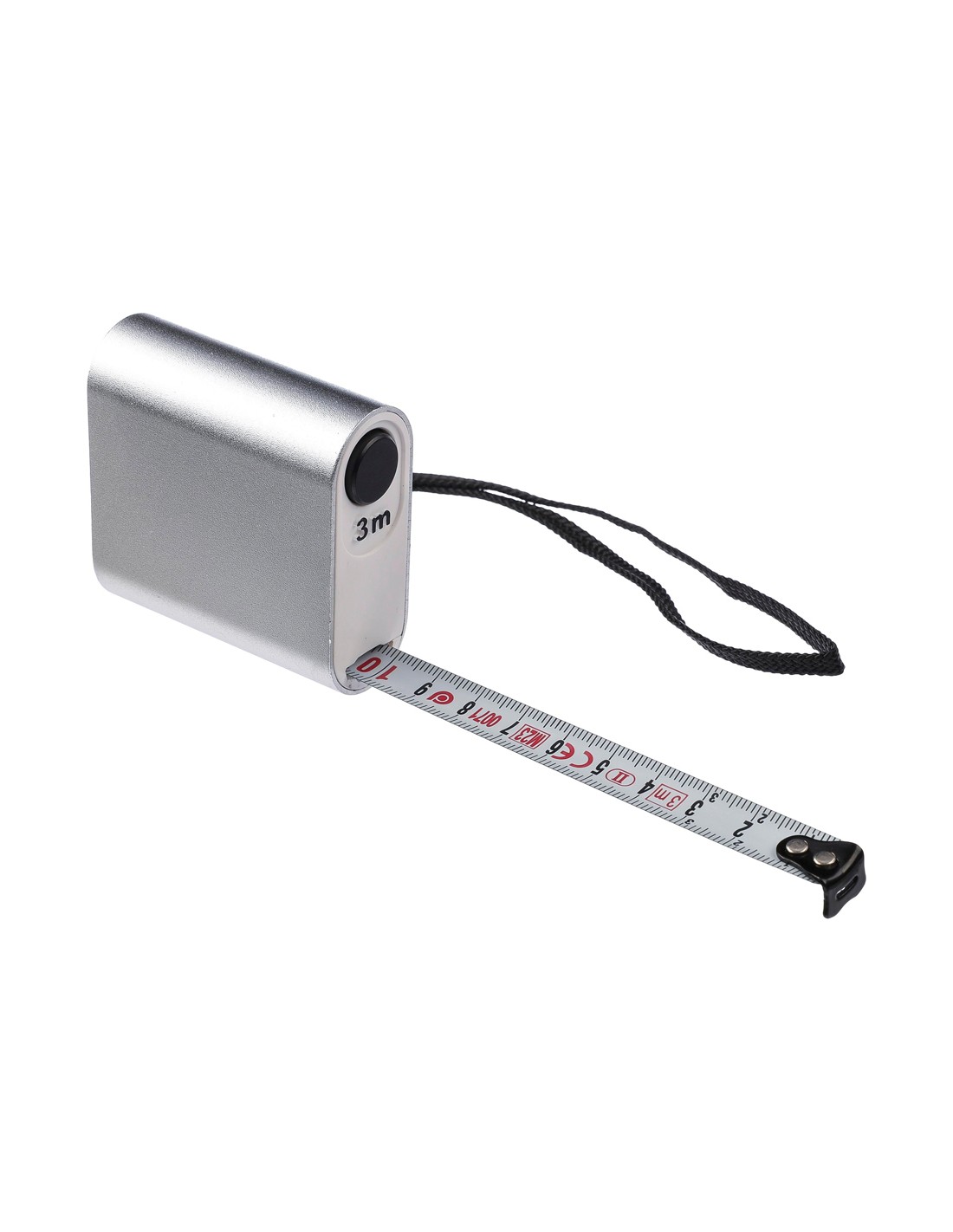 Flessometro in alluminio da 3 metri con pulsante - scala in centimetri incluso cordino da polso - Confezionato singolarmente in una scatola in cartone avana - Colori: Nero, ArgentoF.to cm 5,6x2,4x5,6