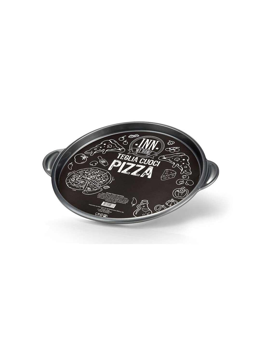 Teglia cuoci pizza Inn My Home con rivestimento antiaderente - progettata per la cottura ideale della pizza nel forno domestico e funzionale come piatto di servizio grazie alle impugnature laterali - facile da pulire - Materiali certificati senza PTFE PFOA BPA - Confezione: cartiglio all'interno del piatto e polybag biodegradabile - F.to: Β 32,5 x 2,3 cm.