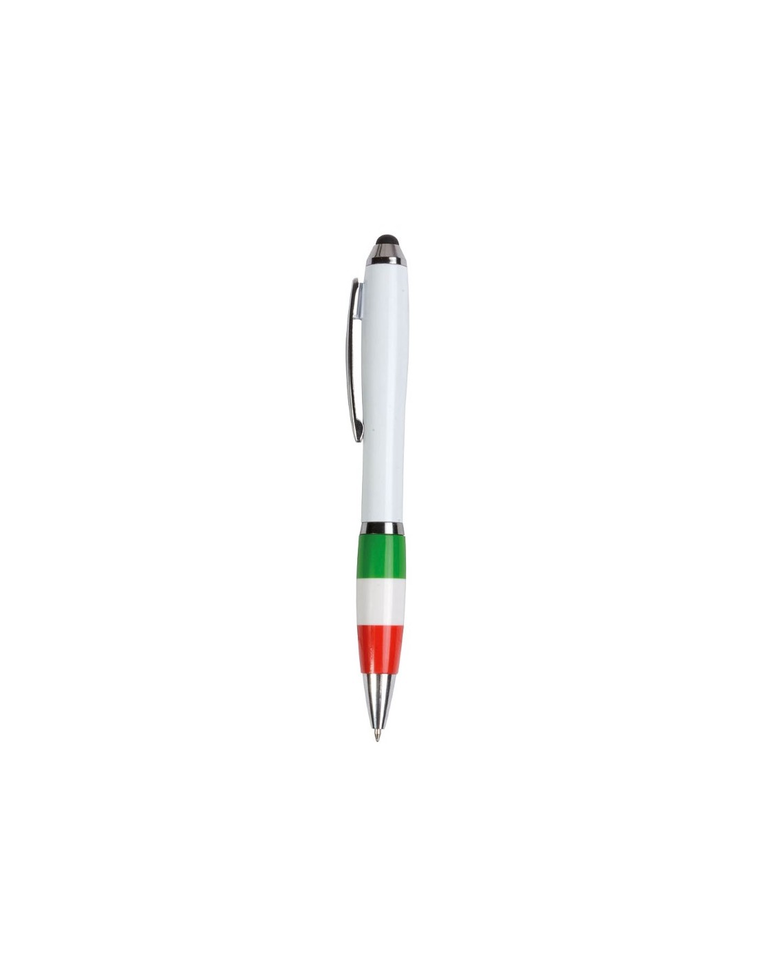 Penna a sfera Tricolore - In plastica - Con meccanismo twist, clip in metallo, fusto bianco, impugnatura tricolore e gommino per touch screen - Refill Nero