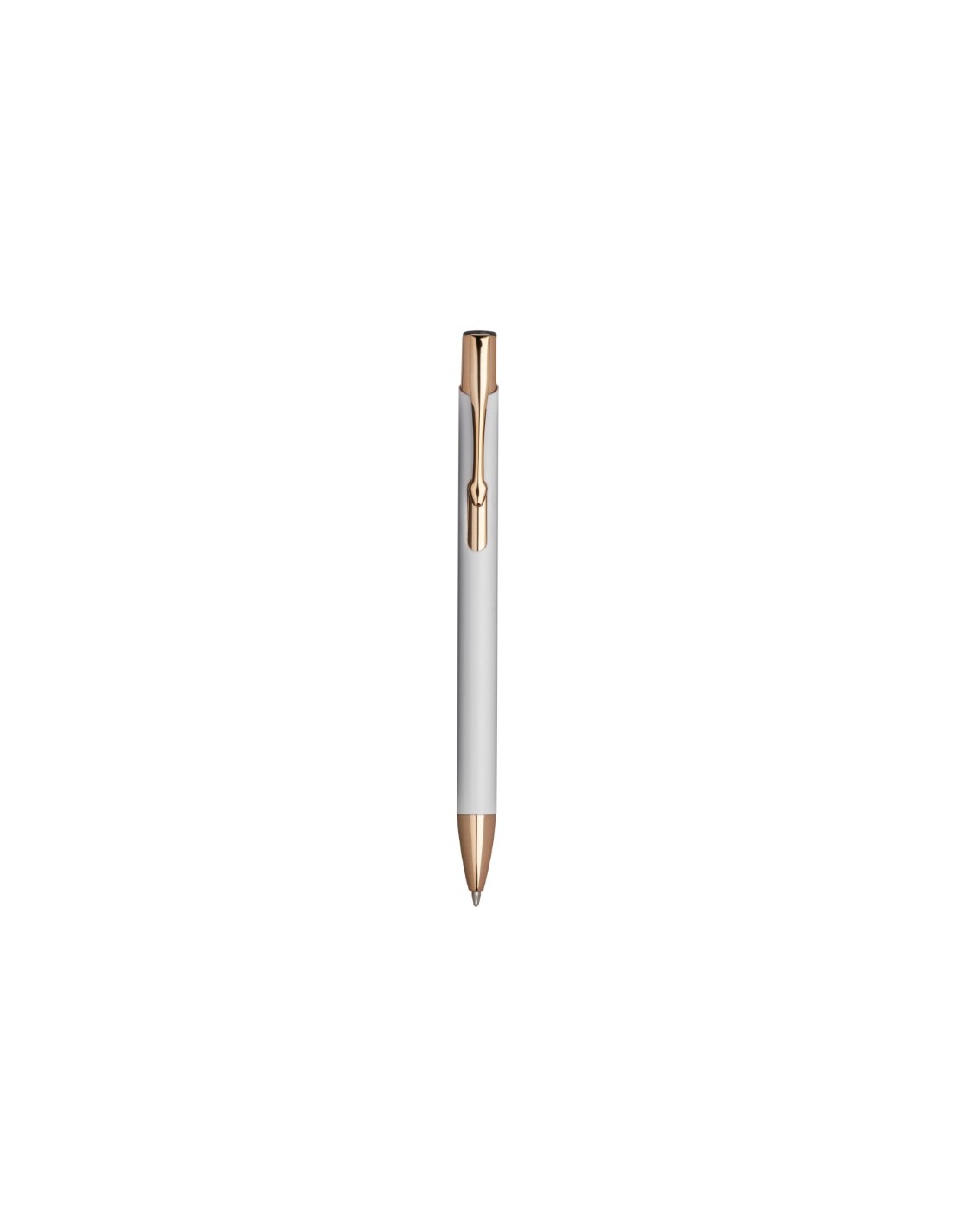 Penna a sfera in alluminio con meccanismo a scatto - Particolari in metallo color oro rosa, finitura interna in color oro rosa idonea per logo laser - Refill Nero - Colori: Bianco, Rosso, Grigio, Blu