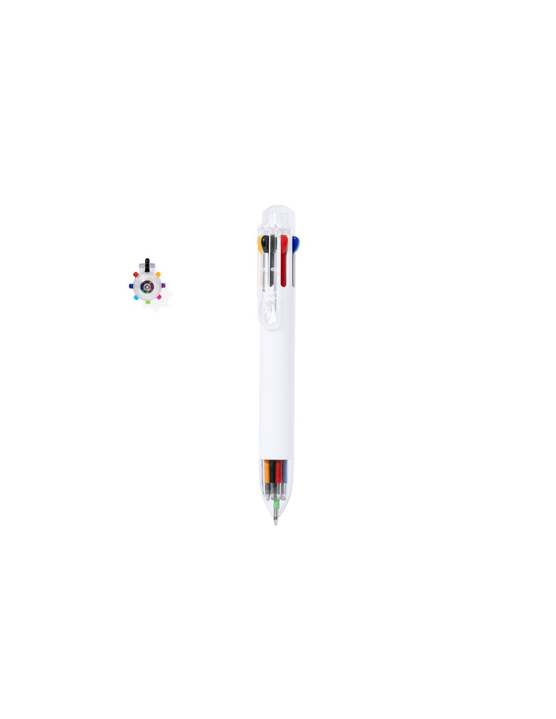 Penna a sfera inchiostro 8 coloriin ABS con fusto bianco, clip e accessori trasparenti, meccanismo a scatto con 8 refill selezionabili facilmente grazie ai pulsanti sulla parte superiore. Refill: Nero, Arancio, Viola, Fuxia, Verde, Azzurro, Blu, Rosso