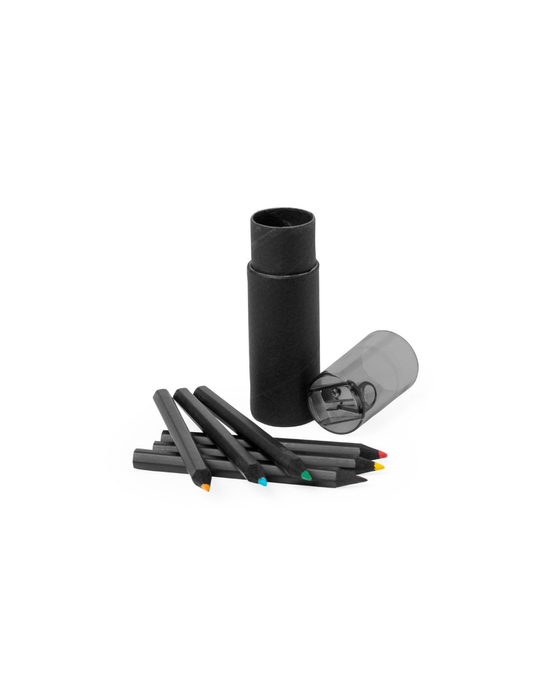 Set 7 matite in legno rifinite in nero e mina in vari colori - Con coperchio trasparente e temperamatite integrato - In confezione cilindrica di cartone riciclato nero - F.to cm Β 2,50 x h 10,5