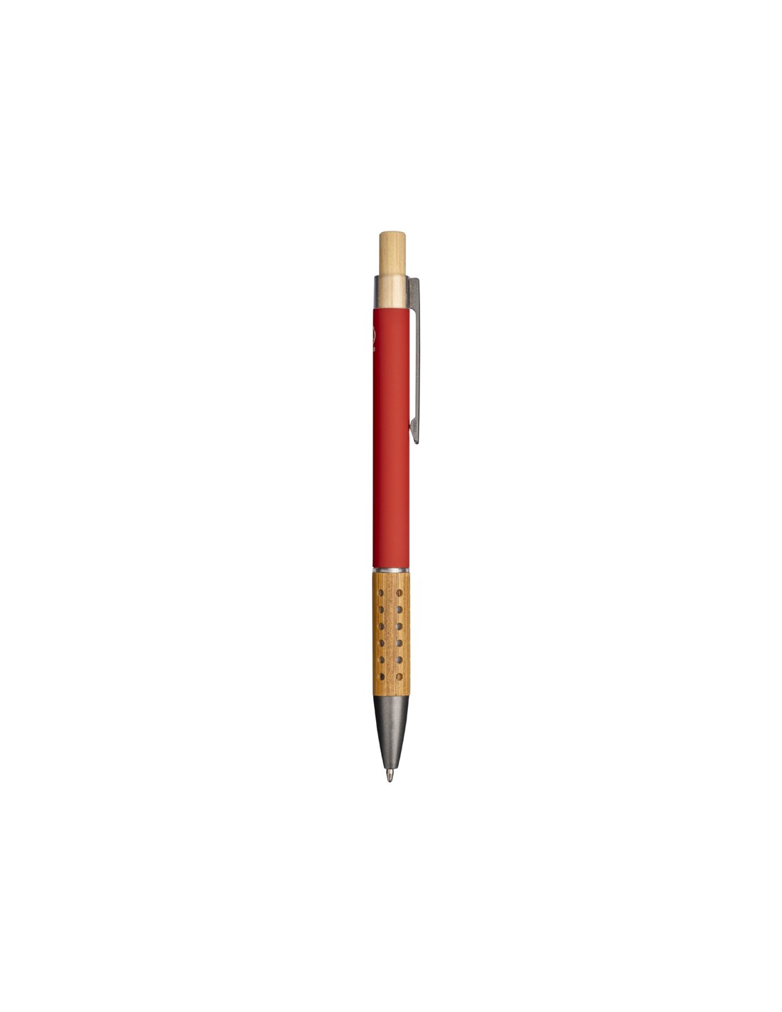 Penna a sfera in alluminio riciclato gommato - Con particolari bruniti, pulsante e impugnatura in bamb -Meccanismo a scatto - Refill Nero - Colori: Rosso, Nero, Royal, Verde, Arancio